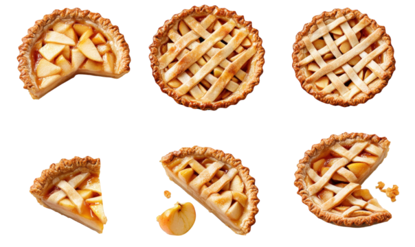 a collection of six delicious apple pies. featuring whole pies. sliced pies. and a single apple slice the pies are arranged in a grid pattern. with the whole pies on the top row. the sliced pies on th