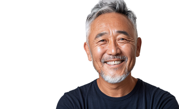 a 60 year old Chinese man that is smiling but Young, stylish, rich. in a T-shirt