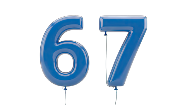 Blue Balloon Numbers 67 on White Background