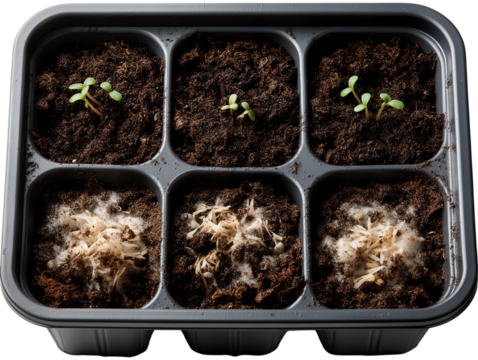 Six soil compartments with seedlings sprouting and white fungus growth.
