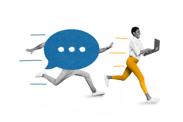 Composite template minimal absurd collage headless person running catch opponent conversation online chat laptop girl isolated on white background