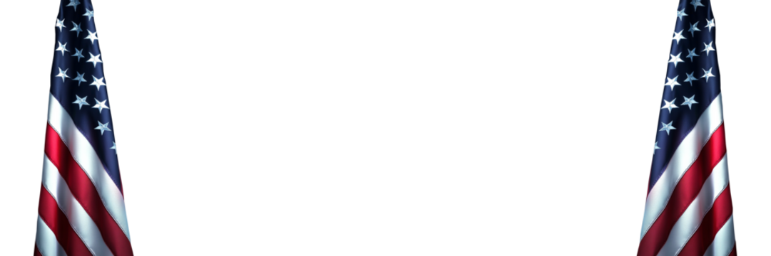 Two American flags on white or transparent panoramic background with copy space, US president and government, american national holiday, July 4, Veterans or memorial day web banner