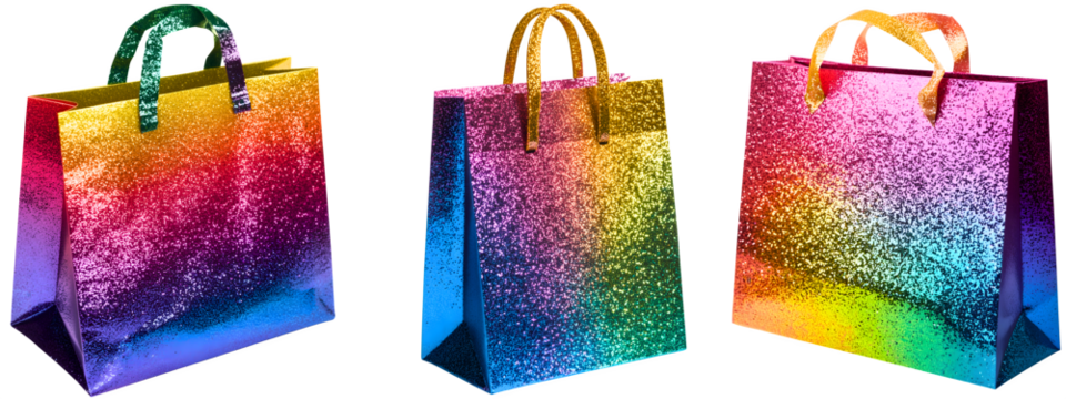 set of 3 glitter, shining festive colorful shopping bags isolated over transparent background; concept of gift shop, birthday shopping, perfect present based on personality and hobbies
