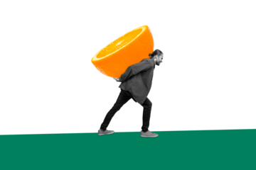 Composite photo collage of dissatisfied man carry big heavy orange half detox diet nutrition fruit citrus isolated on painted background