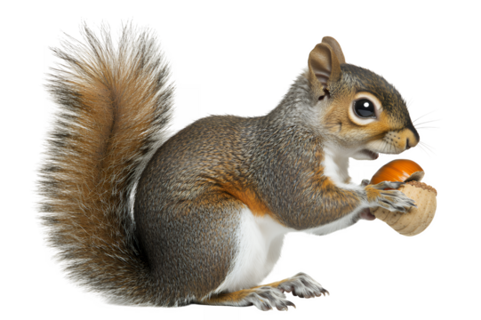 Eastern gray squirrel holding a nut and acorn with a bushy tail 71 characters