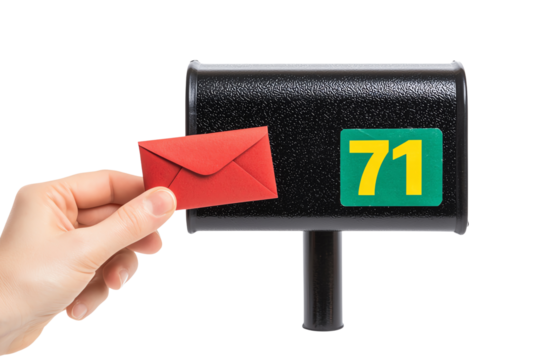 A hand is inserting a red envelope into a black mailbox marked with the number 71.
