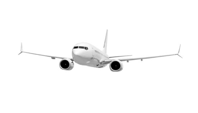 White airplane Boeing 737 Max 737-8 front view angle isolated on a transparent background. Modern passenger jet airplane.
