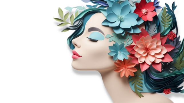 Profile of a beautiful woman with flowers decoration on head. Paper applique. March 8. Beauty, salon decor.