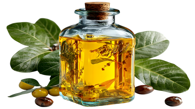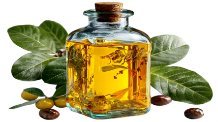 A transparent glass bottle filled with golden olive oil, perfect for culinary branding, isolated on white --ar 16:9 --v 7.0 --s 750