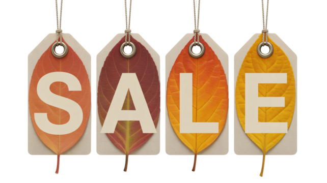Vibrant sale tags with autumn leaves on black background