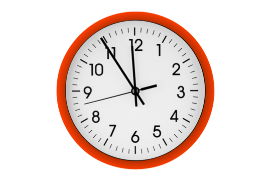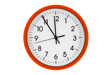 A white round shape wall clock with black hands showing the time of 7 o'clock cutout from background. Short hand at 7 o'clock and long hand at number 12.
