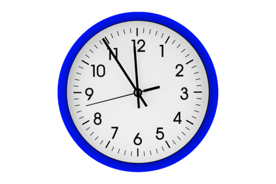 Blue watch, wall clock 11 hours 45 minutes on isolated or white background close up