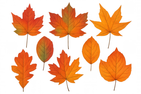 Eight colorful autumn leaves in orange, yellow and brown tones falling on a transparent background