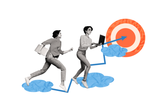 Creative photo collage picture young woman achieve goal aim target laptop remote job project management stock rise up direction