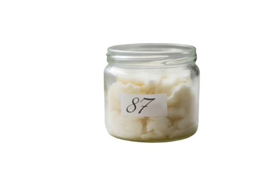 Glass Jar With White Creamy Substance and Number 87 Label