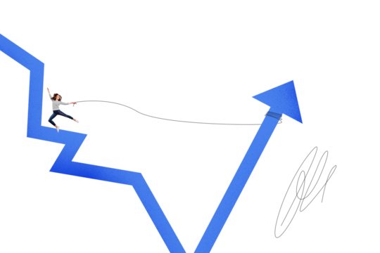Composite photo collage of happy girl catch rope promotion arrow success determination energy career isolated on painted background