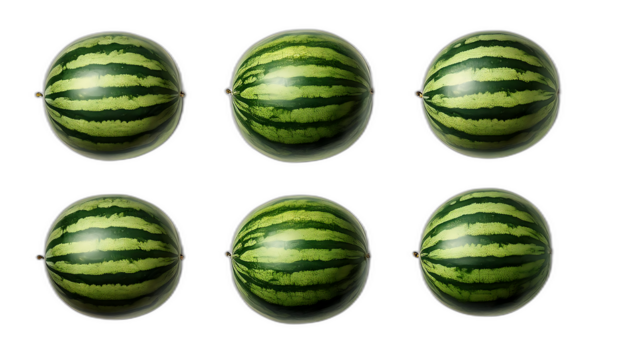 Cocomero (anguria) dall'alto- Sei cocomeri disposti su uno sfondo bianco, visti dall'alto, _1(89)