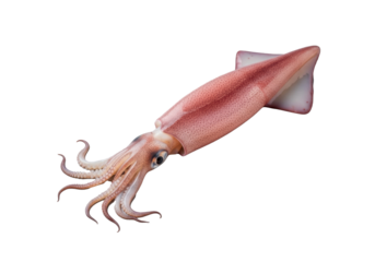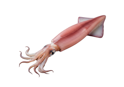 Fresh, raw, slender pinkish-red squid with translucent fins, eight detailed suckered tentacles, glistening on seamless transparent background, ultra photorealistic studio macro shot, concept for