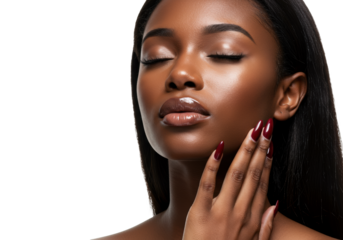 Young african american woman, eyes closed serenely, radiant skin, glossy lips, dark hair, burgundy stiletto nails touching jaw, white studio background, ultra close-up beauty. Concept of feminine