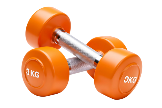 Pair of orange 8kg dumbbells with textured silver handles isolated on transparent background