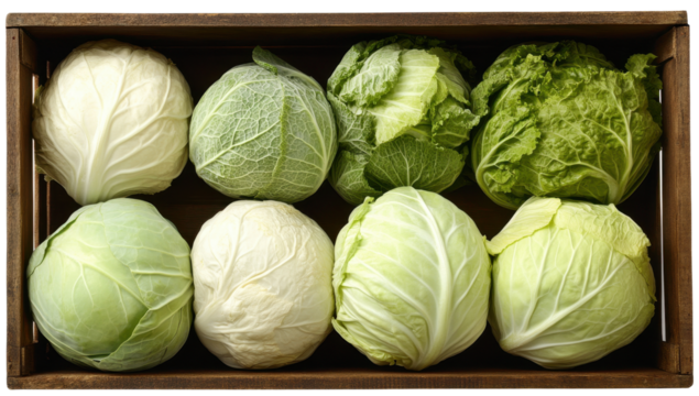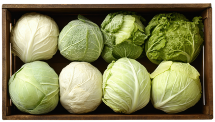 Wooden crate filled with eight whole heads of various cabbage types, showcasing a range of green and white hues