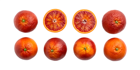 Eight blood oranges whole and halved arranged in two rows on black citrus fruit