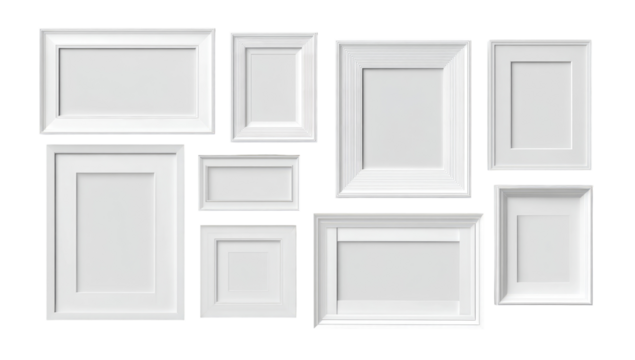 Nine white picture frames of varying sizes arranged in a grid pattern, against a black background.  Empty frames, ready for artwork