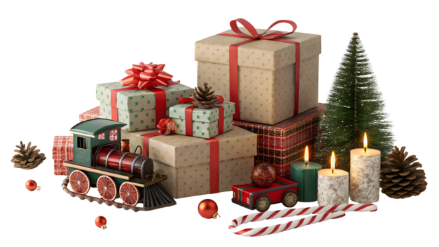 Photorealistic 3 D Render Festive Christmas Scene Stacked Gifts Toy Train Candles Pine Cones Ornaments Red Green Beige isolated on a transparent background