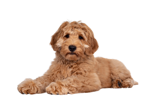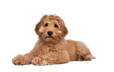 Cute 4 months young Labradoodle pup, laying down side ways. Looking at camera with closed mouth. Isolated cutout on transparent background.