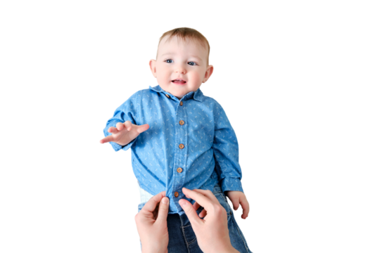 A mother woman puts on jeans pants for a baby boy, isolated on a white background. Mom dresses a happy child in clothes. Kid nine months old
