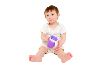 Happy baby drinks water from cup on studio, isolated on white background. Resting child with cup juice in hands, isolated on white background. Kid about two years old (one year nine months)