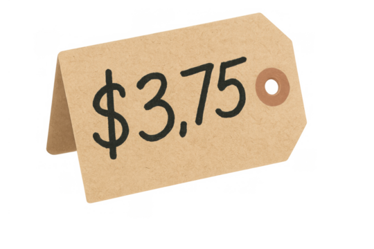 Cardboard price tag displaying $3.75, showing retail cost, market value, and shopping sale item total