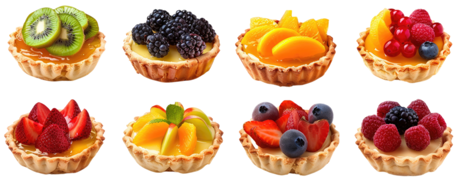 PNG. 8 delicious tarts with various fruits isolated on a white background, photographed with a 24mm lens in the style of various artists