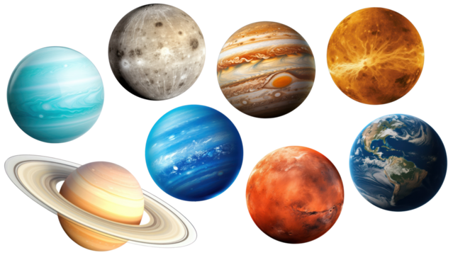 Transparent cosmic rendering of red ringed and blue speckled planets