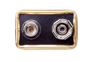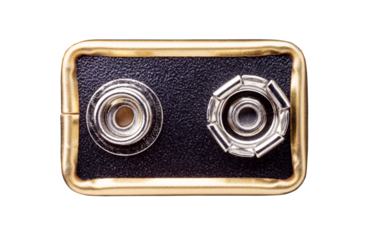 Isolated U444 nine-volt battery, an electric supply with terminals and metallic casing.
