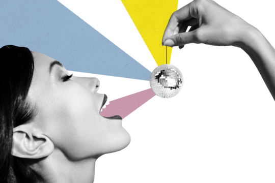 Composite photo collage of pretty girl closed eyes hold disco ball cherry imitation shiny event occasion isolated on painted background