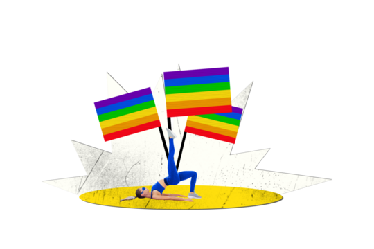 Composite collage picture image of sporty girl stretch lgbt rainbow flag isolated on creative background