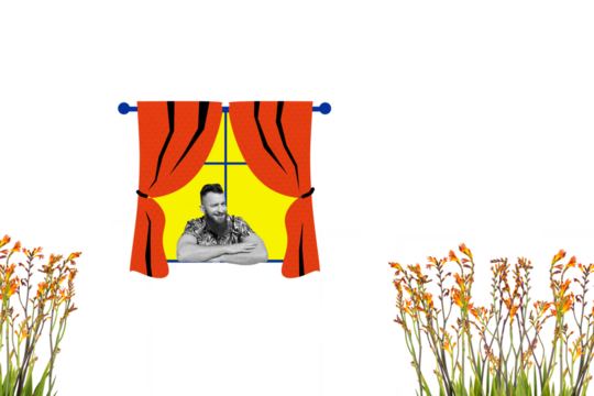 Creative collage picture young man home indoors window curtains environment look watch blossom flowers summertime nature drawing background
