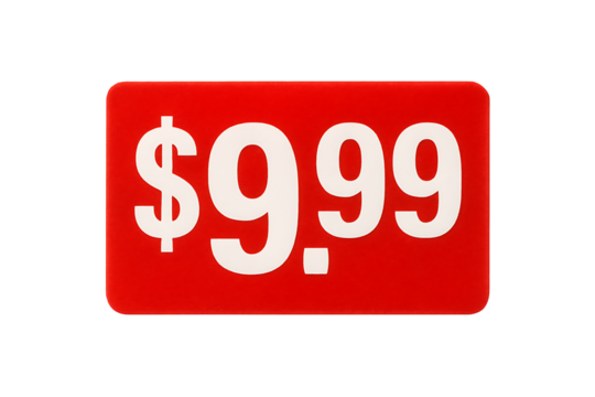 Red price tag showing $9.99 in bold white text isolated on transparent background