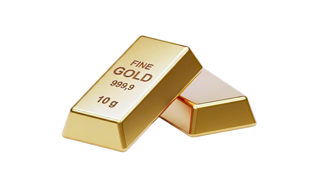 3D Three gold bars with 999.9 fineness and 10g inscription on transparent background