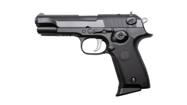 Realistic 9mm bullet firing with muzzle flash and smoke isolated on transparent background