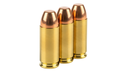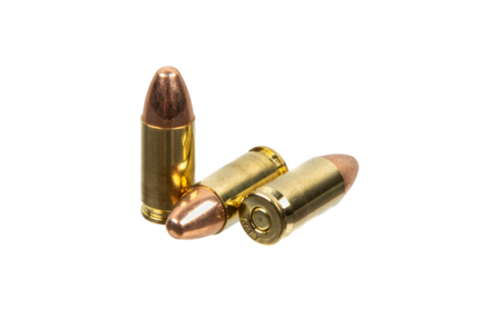 Three 9mm bullets isolated on transparent background, ammunition for handgun or pistol, self-defense and shooting range target practice