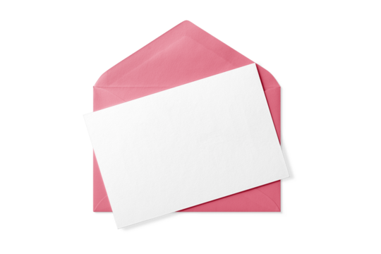 Opened pink paper envelope mockup with paper sheet isolated on a transparent background, PNG. High resolution.