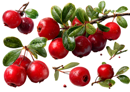 Whole lingonberries and leafy clusters isolated on tansparent background; lingnberry set includes vibran red berries and green folage for forest, culinary, r wellness themes