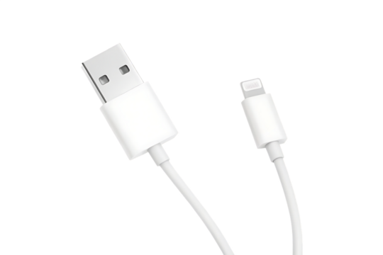 White coiled charging cable, U S B and Lightning connectors, isolated on white or transparent background, AI