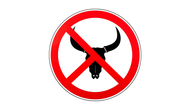 A round red and white sign with a black bovine skull symbol, crossed out, on black