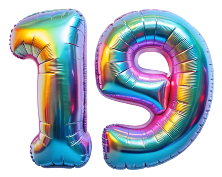 neon holografic foil balloon for birthday in the shape of the number 19 , isolated on the white background
