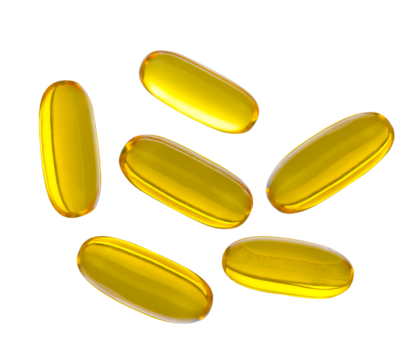 Close up of food supplement oil filled capsules suitable for: fish oil, omega ,evening primrose, borage oil, flax seeds oil, vitamin on transparent png