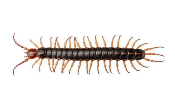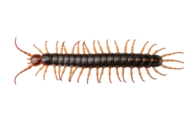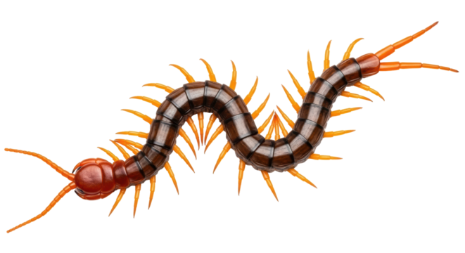 A centipede isolated on transparent background, showcasing its segmented body, numerous legs, and distinctive antennae, crawling and displaying its unique anatomical features
