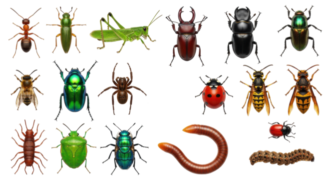 Meticulously arranged collection of diverse, lifelike insects and arachnids: honey bee, jewel beetle, garden spider, on transparent studio background with copy space, no shadows, scientific study